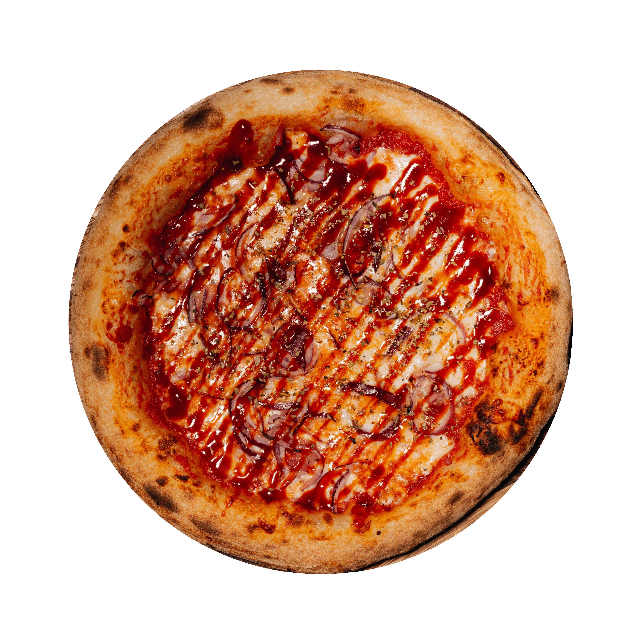 Tomate, mozzarella, lardons, oignons, sauce BBQ