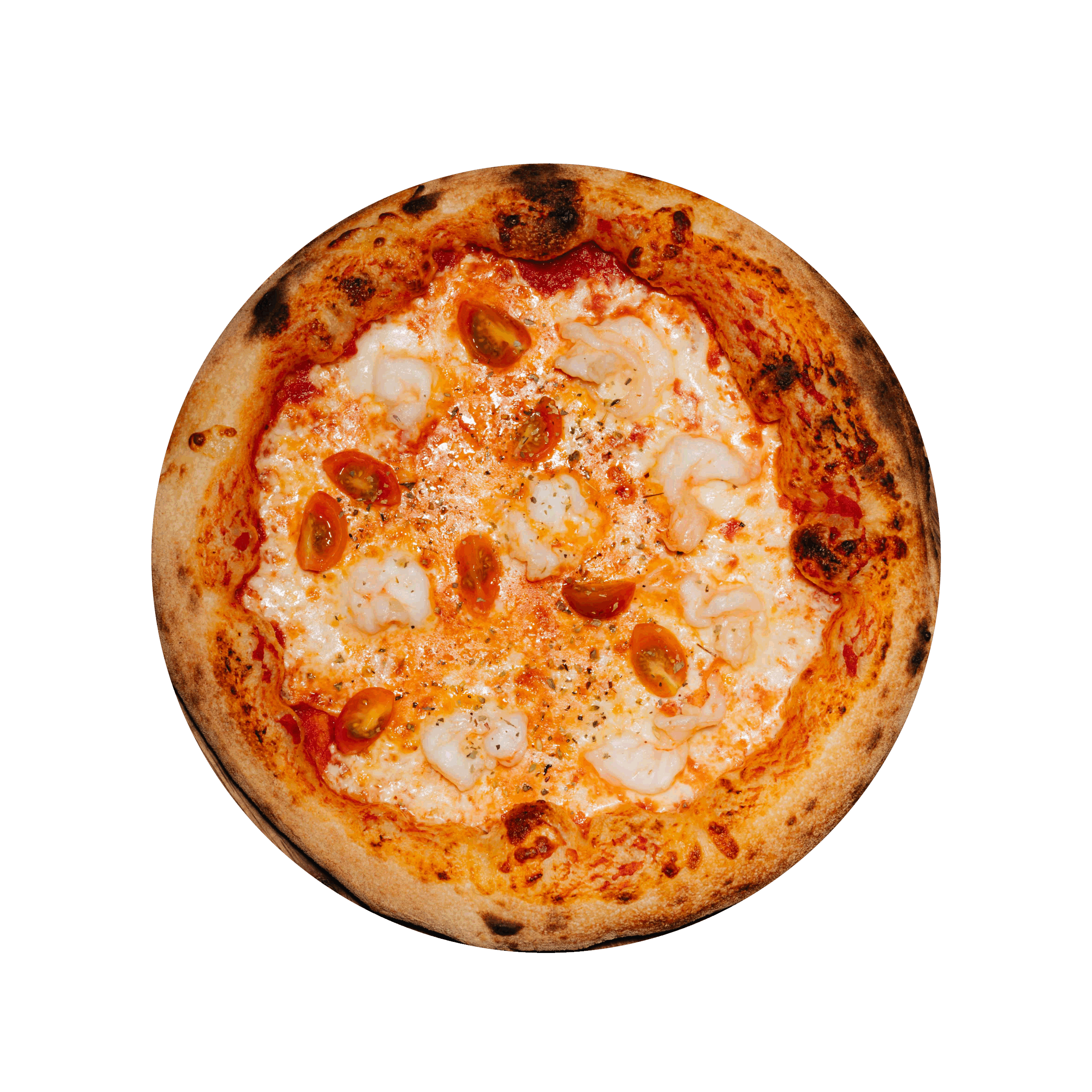 Tomate, mozzarella, scampis, ail, tomates cerises.