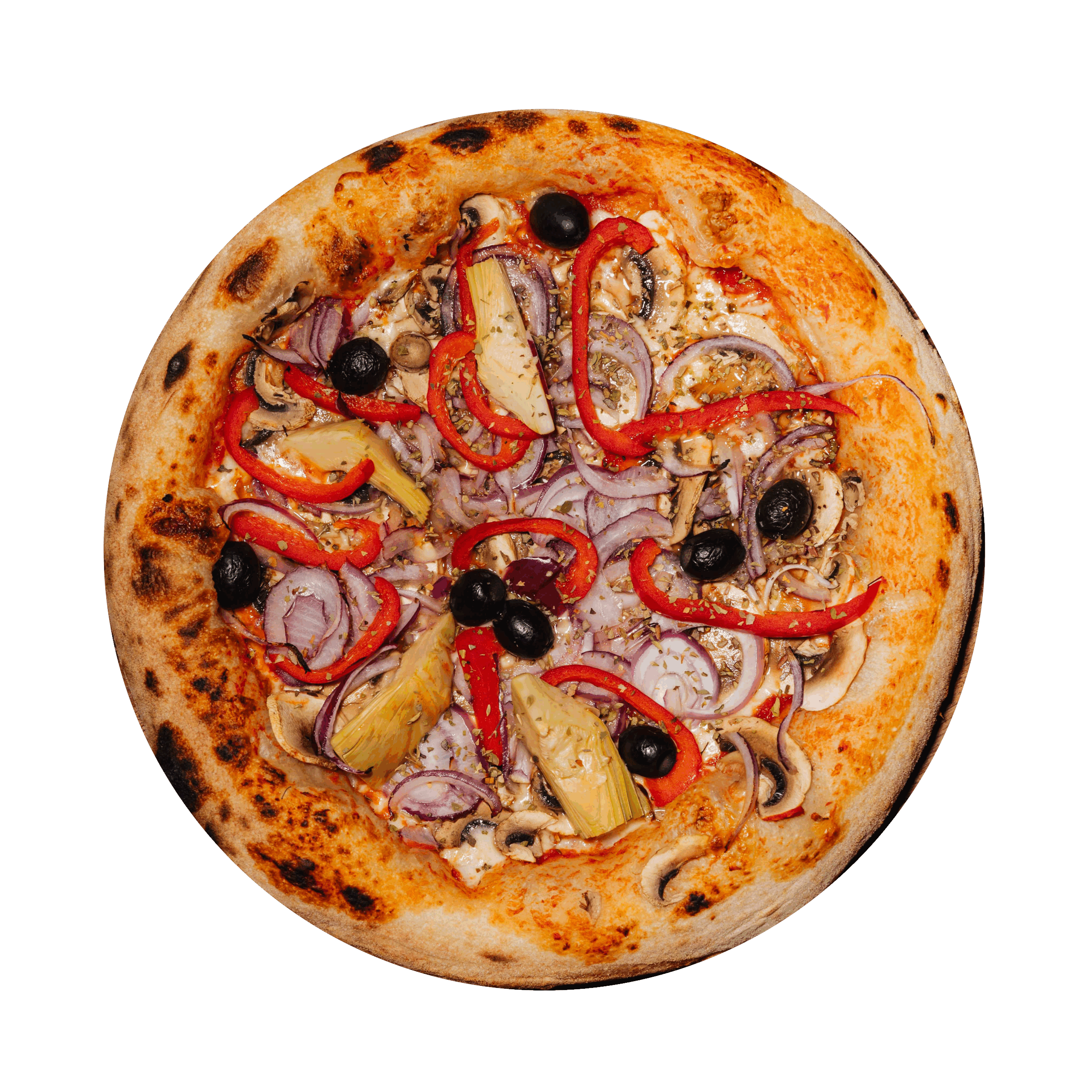 Tomate, mozzarella, champignons, olives, oignons, poivrons, artichauts